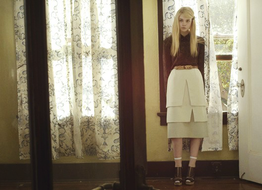 The film has Fanning sporting a golden pout and looks from Rodarte’s Spring 2011 Ready-to-Wear collection. Inspired by their childhood in Northern California, the Mulleavy sisters’ collection pairs a suburban ’70s vibe with uncomplicated precision, which is a far cry from the label’s previous designs. Although it may seem strange to some to see a 12-year-old donning dresses created for women, Elle manages to pull off Rodarte’s mature designs without losing her youthful, ethereal appearance.