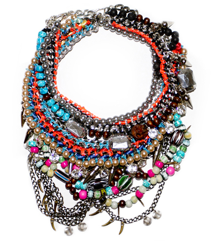 What do you get when you combine glam rock à la David Bowie with ornate bronze crucifixes reminiscent of the Middle Ages? The Spring/Summer 2011 collection from acclaimed jewelry designer Assad Mounser, of course. Titled Neo Conquistador, Mounser’s latest collection follows what she describes as a “future-bound phoenix rising from the ashes of a catastrophic wave of destruction to a path of redemption and rebirth, creating a new world from the rubble” in the process. Each piece is designed to represent a part of the phoenix’s journey.