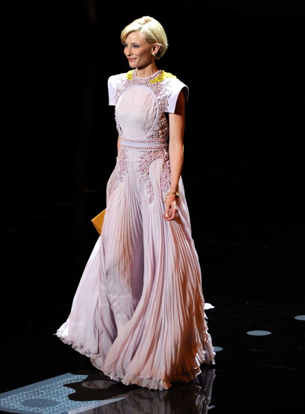 The Oscars is not only a celebration of film: It’s also a time for audiences to celebrate fashion. That being said, “playing it safe” is not a requirement when it comes to picking out an Oscar-worthy gown. This beautiful gown, courtesy of Givenchy Haute Couture (Spring/Summer 2011), is a perfect fit for Cate: The pale violet complements Cate’s pale skin, while her short bob allows for the beaded, structured shoulders of the bodice to take center stage.