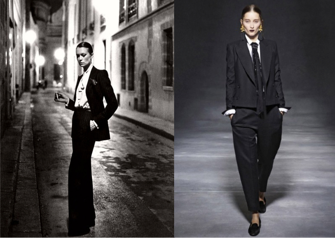When transgender Andrej Pejic took the modelling world by storm, appearing in nearly every editorial and runway in early 2011, was it any wonder that androgynous dressing would soon follow, taking centre stage this Autumn/Winter season? The runways have been taken over by masculine shapes including tailored trousers, pressed white shirts and super-sized slouchy jackets and overcoats, composing a fresh take on the classic boyfriend blazer that we saw not all that long ago. Dolce and Gabbana, Alexander Wang, Moschino and the Olsen twins’ line The Row were just a few of the designers reinvigorating the YSL inspired trend. ‘Le Smoking’ was one of the first tuxedo suits for women of its’ kind, created in 1966 by Yves Saint Laurent. It established the minimalist and androgynous styles for women, which was popularised by Helmut Newton’s famous photograph of a woman donning slicked-back hair in a three-piece suit. It is said that Yves Saint Laurent’s suit has empowered women by giving them the option to wear clothes that were normally worn by men with influence and power. This season, we can expect to see a lot of girls dressing head-to-toe in their boyfriend’s attire, and who knows what they’ll be wearing, with talk of high heels for men becoming the next big trend to follow…watch this space.