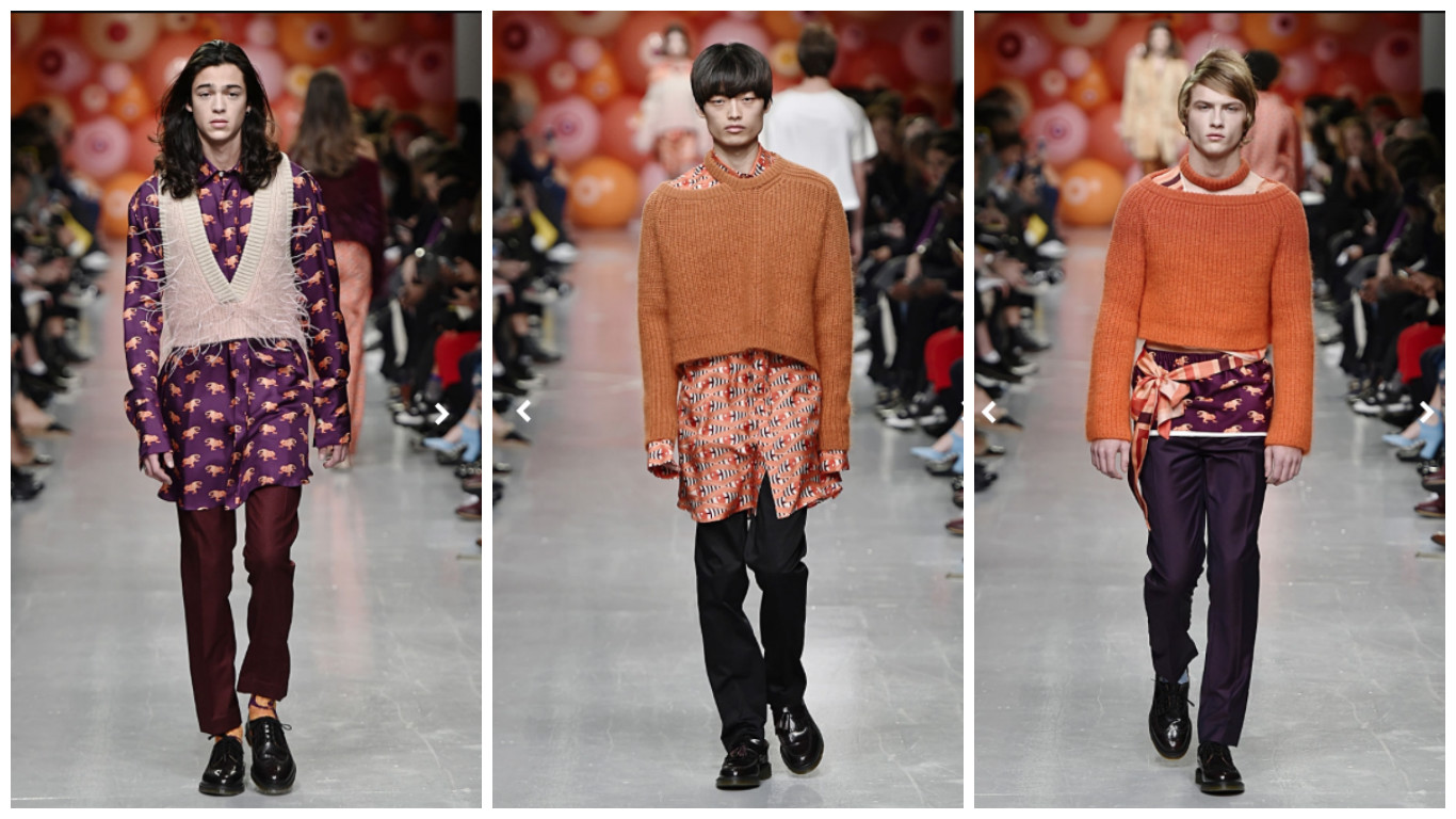Adorned in sensually cut silk negligees, pjs and robes, Eary’s collection whispered ‘come-to-bed’ in a kind of cheeky, Carry On way. Of course there had to be; garish geometric prints, tobacco browns and rich plums (because it’s the 70s, right?), as well as cute repeat print lizards emblazoned across the show. The girls towered down in heels and high hems, and guys sleazily opened their robes just enough to see gold2 chains (and a couple of chest hairs). Oh, and we couldn’t help but love the combination of the smoking jacket with the adorable teddy bears (referencing Brideshead Revisited) clutched in-hand.
