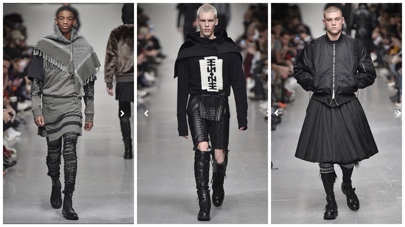 The cult of KTZ, were once again issued with radical directive, that was this season perhaps the most radical of them all. With a subtle sleight of hand, the reaction provoked by the first look the designers sent down the catwalk was that we were in store for a selection of KTZ classics, and indeed we were; with an extreme twist! KTZ delivered a triumph in the ultimate subversion. Black was BACK (but then it never truly goes away), and taking the sporty American jock look, and transforming it into a hardcore Gothic Armour that was the ultimate riff on traditional masculine/feminine notions. In a typical stroke of twisted genius, KTZ took the signature over-sized baseball ball stitching, and deployed in such a manner that garments took on a heavy lingerie style effect. Stitching along sleeves, down the back of legs to suggest hosiery, and cinching as the waists like corsets. Amongst the thus evolved KTZ staples that formed the collections bulk, the aesthetic was given further exploration and validation, I’m a wealth of looks, including models sporting rugged bombers, over Ra Ra skirts! It was an alternative vision of masculinity, that in its incorporation of femininity, was a runway success that will certainly become a popular aesthetic amongst the gender fluid generation, and one often adopted and imitated by KTZ peers. Bravo!