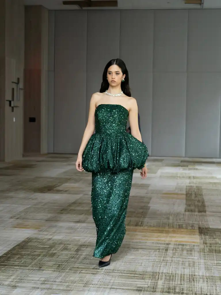 Veejay’s eveningwear shined the most to me. There was one black gown that had a fitted, sleeveless top, with a gigantic, flowy feathered bottom. Another standout was a white see-through fishnet-style dress with white leather fringe shaping the silhouette. And there were many sparkling tones – green, purple, and pink to name a few – that Veejay showed on a variety of different sizes. I felt like Veejay’s eveningwear could make any woman feel glamorous, which is hard to achieve.