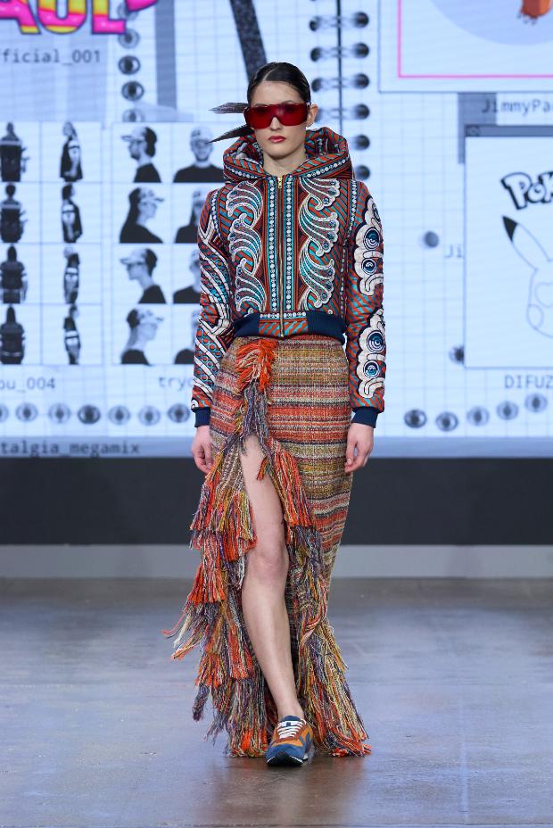 Jimmy Paul is known for his out-of-the-box, hyper-colourful garments. This London Fashion Week, he perhaps gave himself his biggest creative challenge yet, partnering with Pokémon to create over fifteen looks inspired by Pokémon characters, symbolised through clothing.