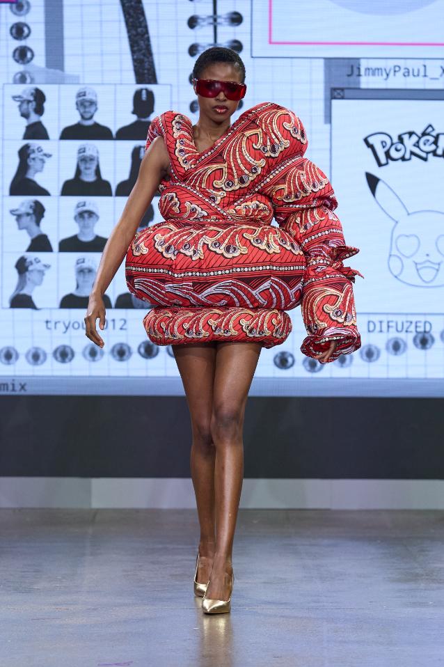 A more avant-garde look, one I could imagine on someone wanting to make a statement on the VMAs red carpet, was his “Togepi” design. Togepi is a Pokémon that symbolises good luck and is depicted emerging from an egg. Paul recreated that idea in the mini dress he designed. The dress was multi-coloured, in Togepi’s colours of course, yellow, red, blue, and white. It featured two tube-like embellishments, making it look as though the dress itself was hatching. Was there a lot going on? Absolutely. Did I find it really fun and creative? Also absolutely.